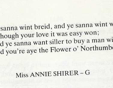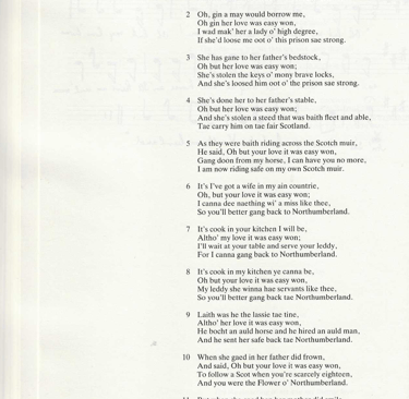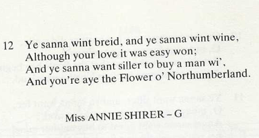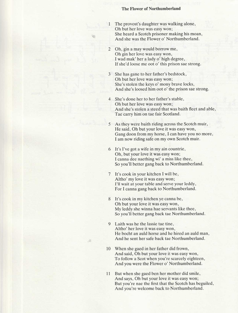 1149 The Flower Of Northumberland – 12 verses [standard text sung by Enoch Kent] [This is Annie’s octogenarian uncle’s version. Her father used to recite it, adding the moral ‘Aye tak care o theysel'.