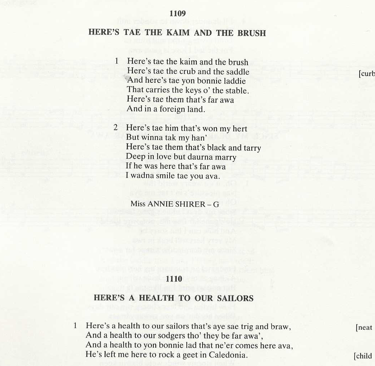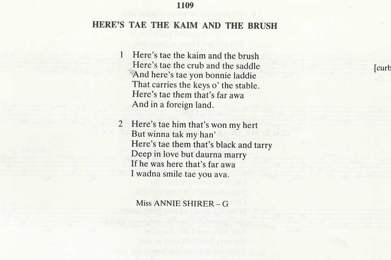 1109 Here’s Tae The Kaim And The Brush – 2 verses 5 lines each, sole version