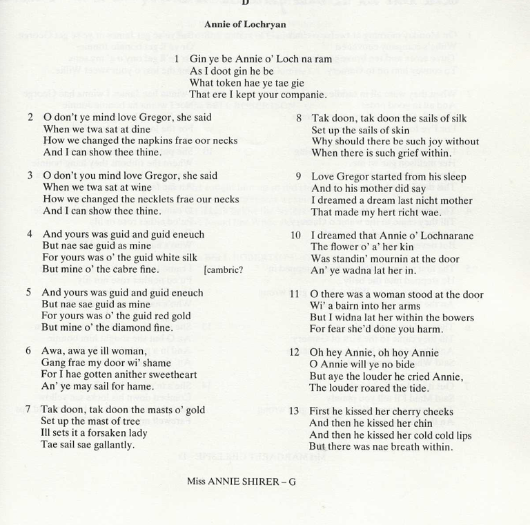 1226 Annie Of O Loch Na Ram (Lochryan) – 13 verses [a rich version] [From a ballad book. Long ago]